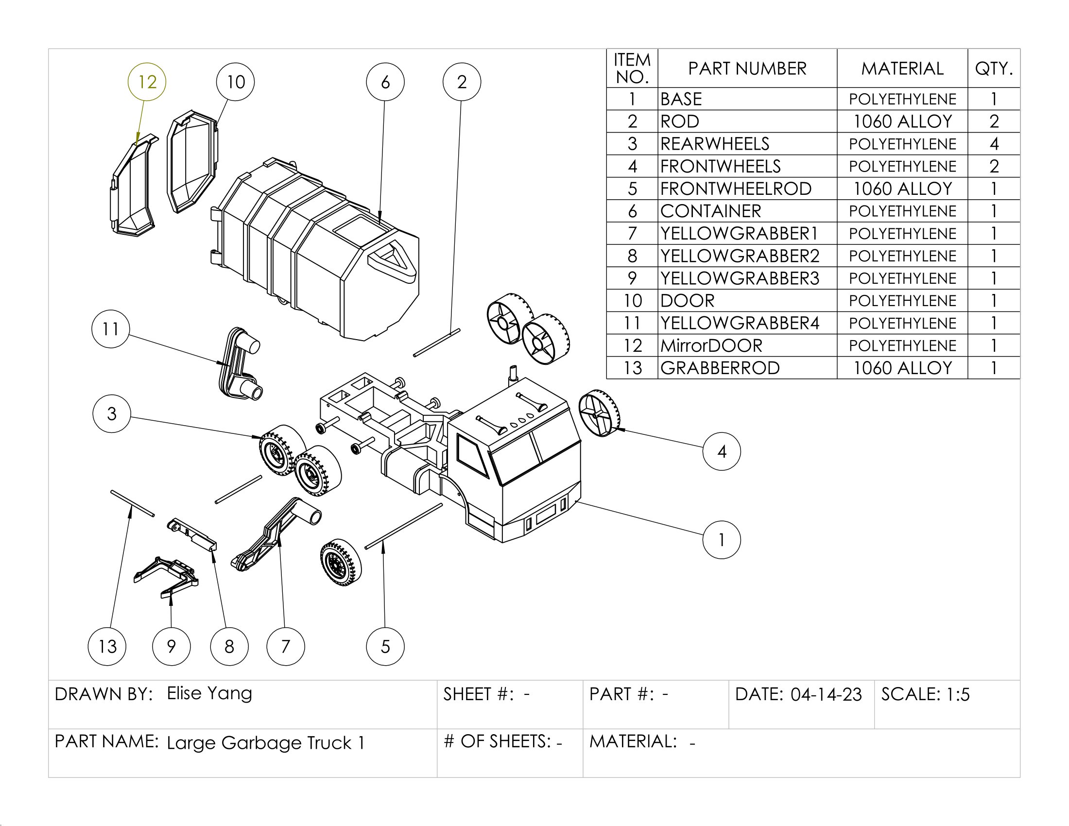 CAD assembly of a toy garbage truck, with 13 distinct parts. Parts measured accurately and modeled on SolidWorks from scratch.